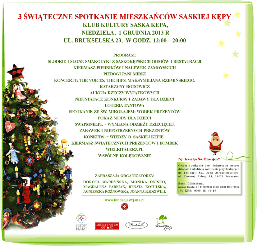 Serdecznie zapraszamy do udziału w 3. Świątecznym Spotkaniu Mieszkańców Saskiej Kępy, które odbędzie się 1 grudnia w godz. 10:00 - 20:00 w Klubie Kultury Saska Kępa przy ul. Brukselskiej 23.